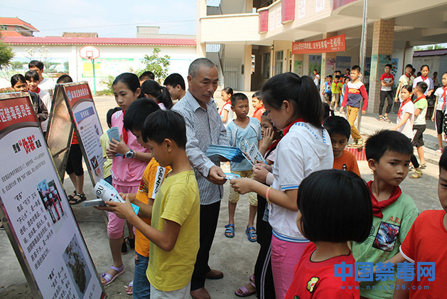 图为学生观看禁毒宣传展板。中国禁毒网发