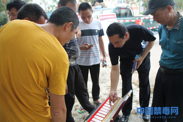 图为工作人员向村民讲解毒品仿真模型。中国禁毒网发