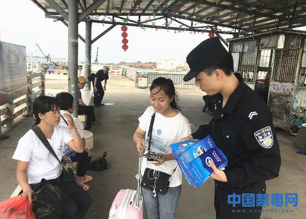 中国禁毒网讯 为加强辖区禁毒攻势,充分调动海岛群众参与禁毒斗争的积极性、主动性和自觉性,4月16日,广东省湛江经济技术开发区东简边防所走进客轮渡口开展禁毒宣传活动。