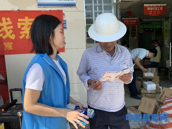 图为松竹禁毒社工向群众发放传单并讲解毒品知识。中国禁毒网发