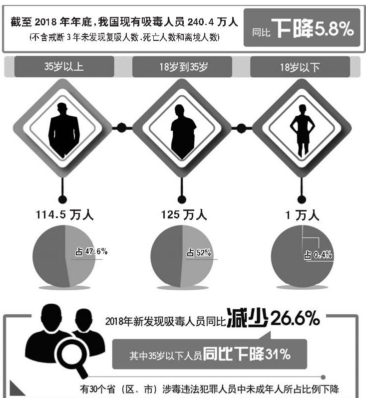 据悉,截至2018年年底,全国现有吸毒人员240.4万人(不含戒断3年未发现复吸人数、死亡人数和离境人数),同比下降5.8%。