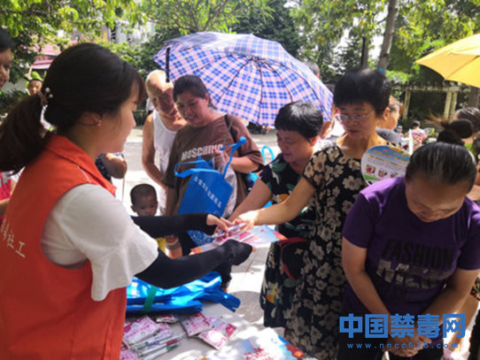 图为禁毒社工向群众派发禁毒宣传资料。中国禁毒网发