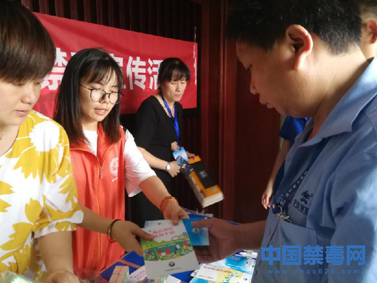 图为禁毒社工向企业职工发放禁毒宣传册。中国禁毒网发