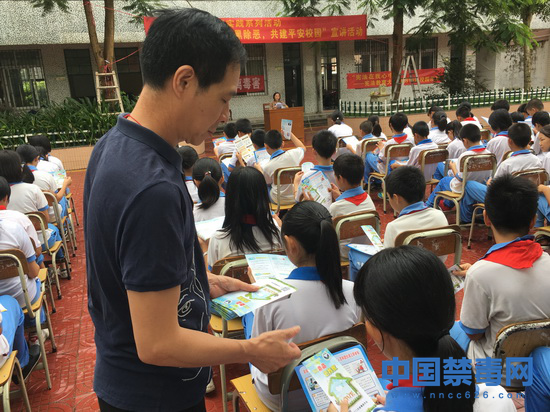 图为禁毒志愿者向学生派发禁毒宣传资料。中国禁毒网发