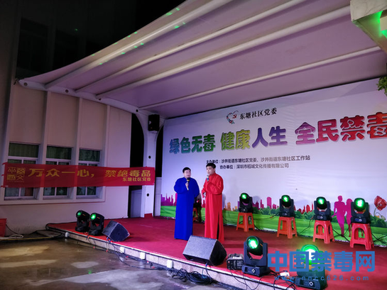 中国禁毒网讯 8月19日,深圳市宝安区沙井街道东塘社区党委在辖区欢乐楼开展“ 绿色无毒 健康人生 全民禁毒”禁毒文艺宣传晚会。