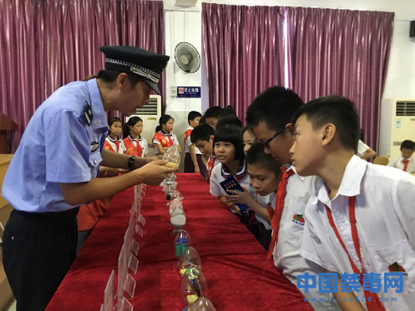 图为禁毒民警结合毒品仿真模型为学生们讲解毒品知识。中国禁毒网发