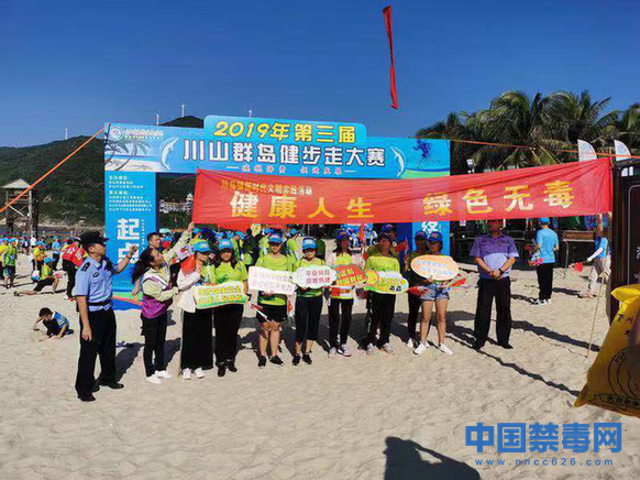中国禁毒网讯 9月22日,广东省台山市川岛镇禁毒办联合川岛司法所、下川边防派出所、挚爱社工等相关部门结合2019年第三届川山群岛健步走大赛,在下川王府洲旅游区联合开展“健康人生 绿色无毒”为主题的禁毒宣传活动。