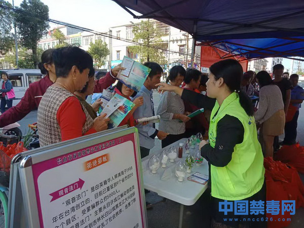 中国禁毒网讯 11月8日,广东省台山市汶村镇禁毒办联合镇司法所、派出所、社工中心等部门,在圩镇开展禁毒宣传进社区活动。