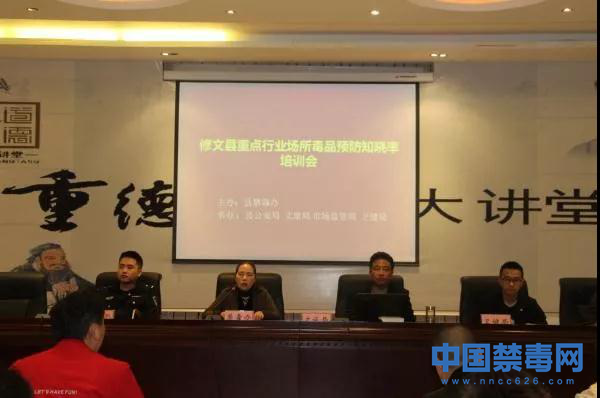 中国禁毒网讯 11月13日,贵州省贵阳市修文县禁毒办联合县文旅局、县公安局、市场监管局和卫健局,共同开展全县重点行业场所从业人员毒品预防教育培训,全县重点行业场所60余人参加培训。