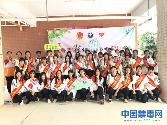 11月21日,江门中医药学校同学们参加禁毒宣传活动后合影。当日,广东省江门市蓬江区禁毒办联合社工中心在江门中医药学校开展以“青春不毒行,要no也要know”为主题的禁毒宣传活动。中国禁毒网发