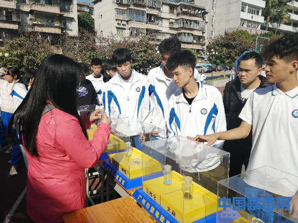 12月5日,学生们在观看仿真毒品模型。当日,广州白云行知职业技术学校开展了以“远离毒品,关爱未来”为主题的禁毒宣传活动。中国禁毒网发