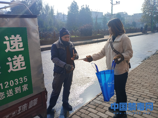 12月10日,禁毒办工作人员向快递物流从业人员发放禁毒宣传手册。当日,贵州省六盘水市大湾镇禁毒办到辖区内各家物流寄递行业,开展禁毒知识宣传活动。中国禁毒网发
