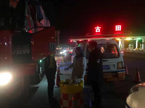 古田县禁毒民警按照县公安局统一部署,积极配合卫生部门加强联防联控,坚守高速路口开展值守检查,全力投入新冠肺炎疫情防控排查工作中,对过往车辆及人员开展背景核查,为群众讲解防疫知识。
