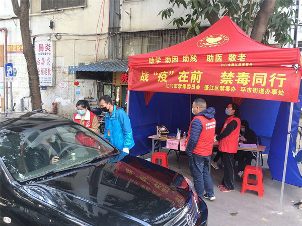 在现场,工作人员对出入社区人员逐一进行体温测量、派发抗击新冠肺炎宣传单和禁毒宣传小册子,叮嘱居民群众疫情期间做好防疫防控措施,提高对“两毒”的防护意识,如发现体温异常人员,及时引导至相关医院检查诊疗。