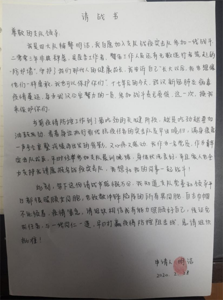 她亲手书写了一份请战书,并按上自己的手印,书中写道:2003年非典疫情,是无数逆行者筑起的“防护墙”,守护了我们那代人健康成长;17年后的今天,新冠肺炎疫情发生,作为一名年轻党员,身为武汉公安警力的一员,参加战斗,责无旁贷。