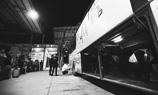 近日,云南省普洱市公安局开展为期15天的查缉毒品实战练兵活动,提高民警的实战能力。图为民警在墨江哈尼族自治县练兵主战场检查一辆大客车。 李渝冰 摄