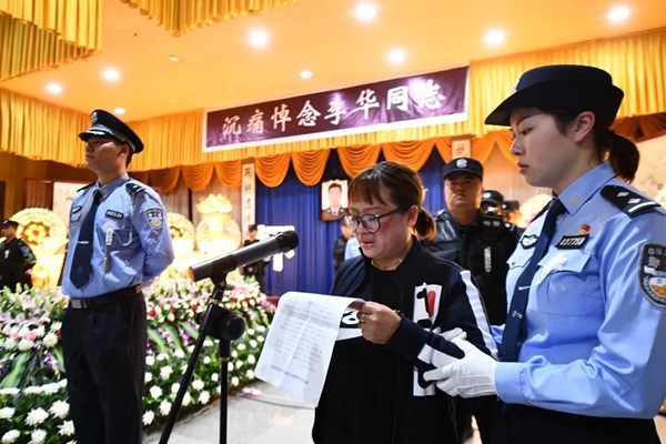 贵州市公安局乌当分局党委副书记、政委杨忠平主持仪式,并宣读贵州省公安厅政治部《唁电》,乌当区人民政府副区长、区公安分局党委书记、局长谢军同志致悼词,李华妻子陆英同志致辞。