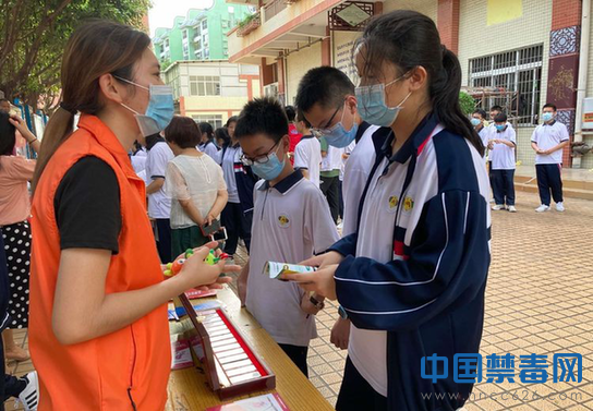 图为工作人员向学生展示仿真毒品模型。中国禁毒网发