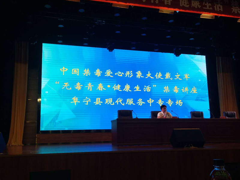7月16日,阜宁籍中国禁毒爱心形象大使戴文军来到阜宁县现代服务中专进行“无毒青春·健康生活”禁毒专题讲座。这是阜宁县司法局联合公安局、检察院、教育局共同开展的法治进校园活动之禁毒专场,以进一步推进青少年毒品预防教育,提高在校高年级学生的禁毒意识。