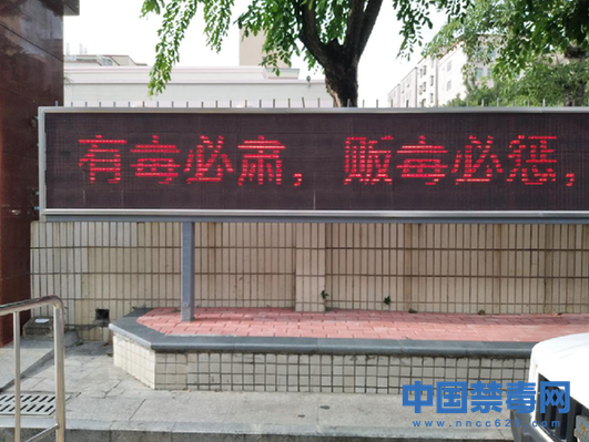 图为辖区LED屏幕播放禁毒宣传标语。中国禁毒网发