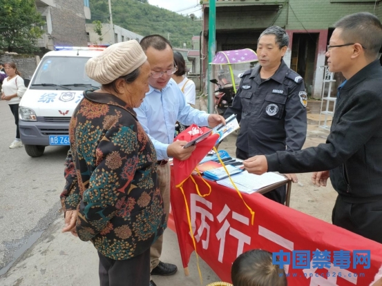 图为禁毒办工作人员向群众发放禁毒宣传单。中国禁毒网发