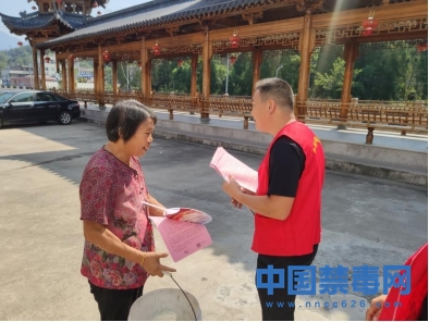 图为禁毒专干向群众发放禁毒倡议书。中国禁毒网发