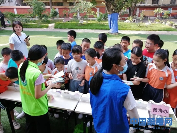 图为禁毒社工向学生们发放禁毒宣传单。中国禁毒网发