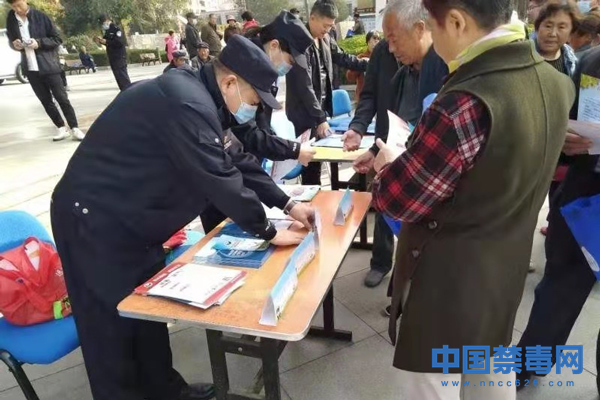 图为公安民警向群众发放禁毒教育宣传单页。中国禁毒网发