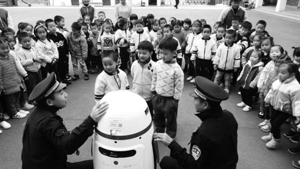 12月9日,福建省顺昌县公安局元坑派出所民警携带5G禁毒专用智能机器人,前往小学、幼儿园宣传禁毒知识。陈柏材 摄