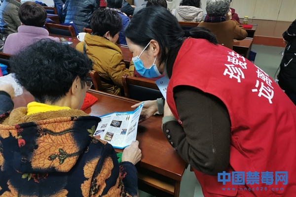 图为禁毒社工向居民发放禁毒宣传册。中国禁毒网发
