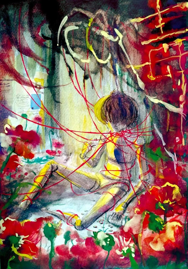 在逼仄的、状若囚室的角落里,一个枯瘦如柴的少年被恶之花结成的恐怖蛛网缠绕。血色的罂粟花正在盛放,囚徒的生命却在渐渐枯萎。两者对比非常明显,给人以强烈的视觉冲击力。