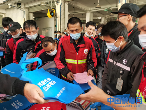 图为禁毒社工向工作人员发放禁毒宣传资料。中国禁毒网发