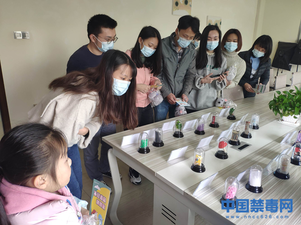 图为企业职工观察毒品仿真模型。中国禁毒网发