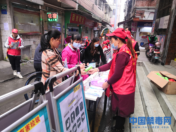 图为禁毒志愿者向群众发放禁毒宣传手册。中国禁毒网发