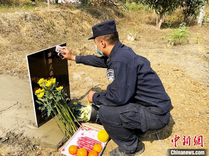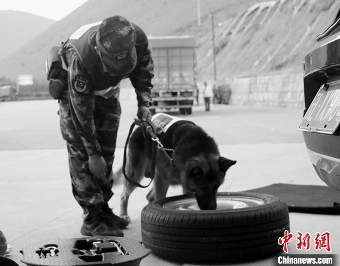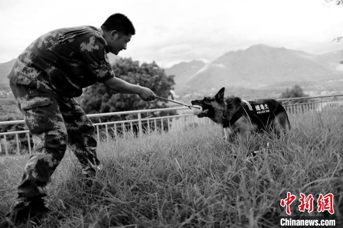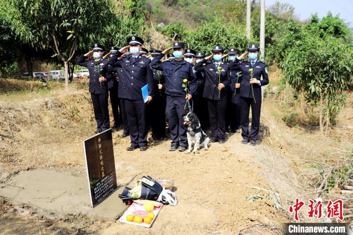 “滨哒的一生都在奉献。执勤口岸有它灵活的身影,查缉现场有它敏捷的身手。如果有来世,我们还与滨哒做战友。”民警含泪为滨哒写下悼念词。(张锦难 唐霖源 朱洁)