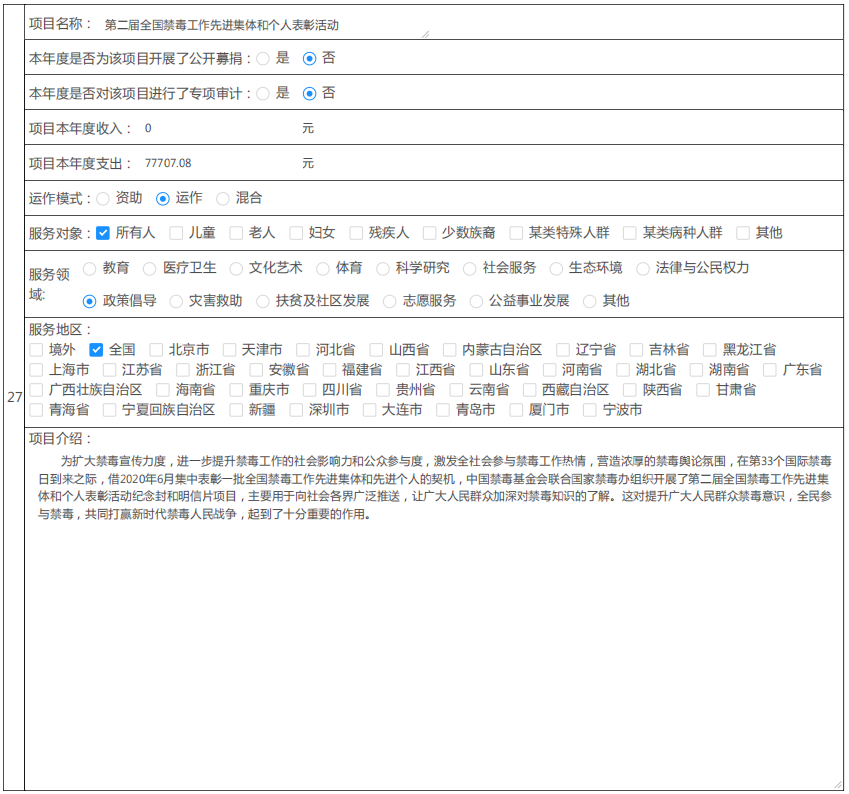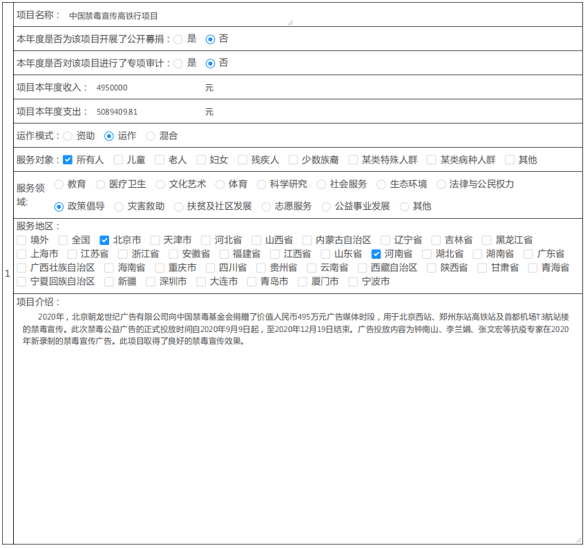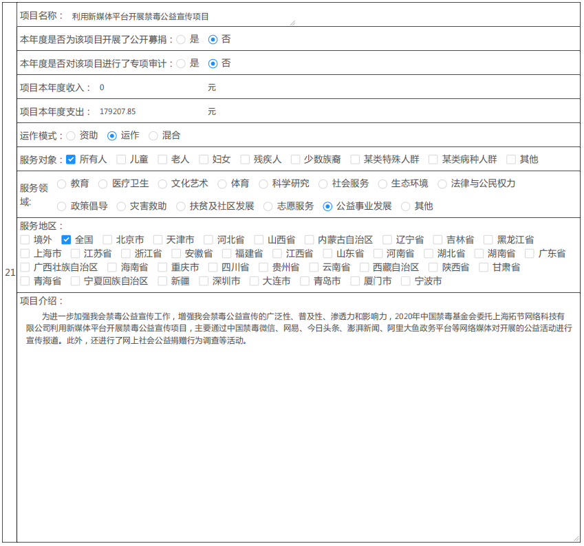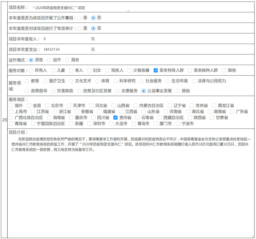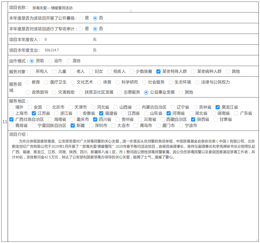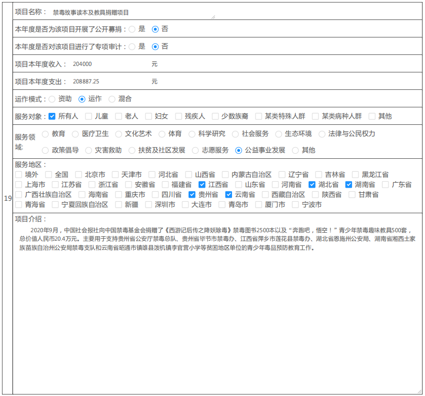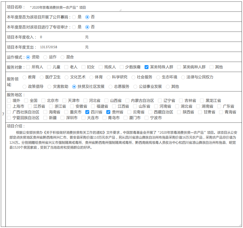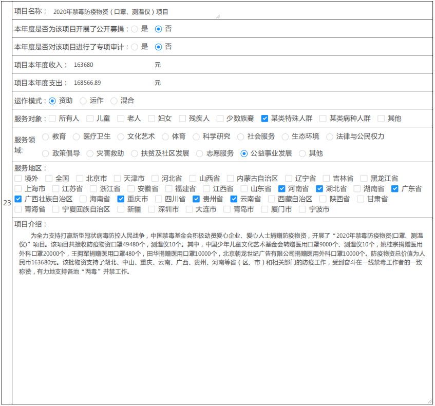 中国禁毒基金会2020年度公益慈善项目开展情况