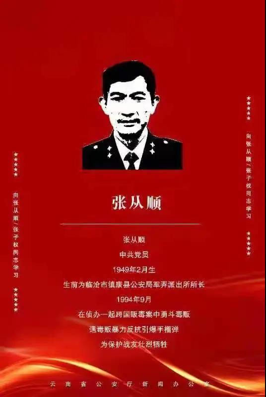 张从顺,男,中共党员,1949年2月生,生前为云南省临沧市镇康县公安局军弄派出所所长。1994年9月,在侦办一起跨国贩毒案中勇斗毒贩,遇毒贩暴力反抗引爆手榴弹,为保护战友壮烈牺牲。