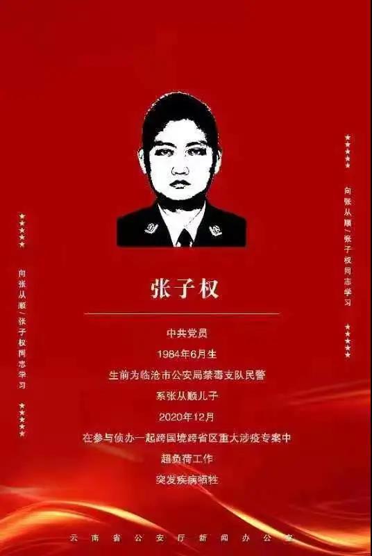 张子权,男,中共党员,1984年6月生,生前为云南省临沧市公安局禁毒支队民警,系张从顺儿子。2020年12月,在参与侦办一起跨国境跨省区重大涉疫专案中超负荷工作,突发疾病牺牲。
