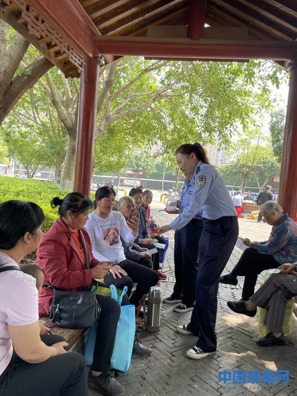 图为禁毒民警在广场休息区为群众宣传禁毒知识及发放宣传资料。中国禁毒网发