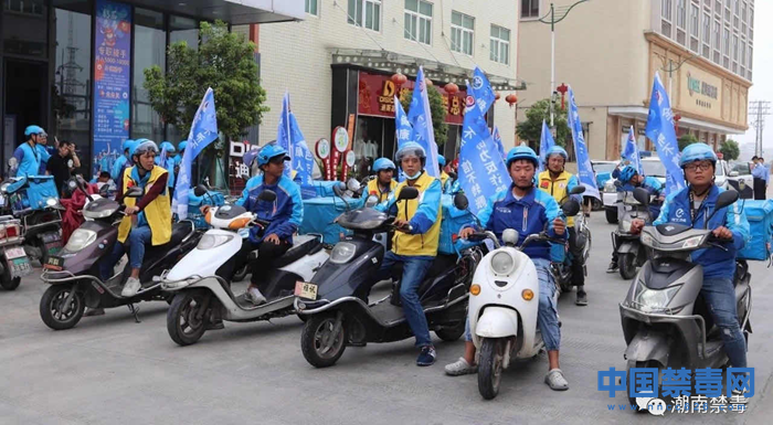近百位骑手骑上挂着“交通安全,文明出行”“绿色人生,健康无毒”“全民协力反诈骗,不听不信不转账”等宣传标语的电动车,开启送“外卖+宣传”的宣传模式,在送外卖的同时,将禁毒、反诈、交通安全等知识传递到千家万户。