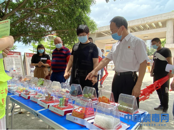 图为禁毒专干向政府职工展示毒品仿真模型。中国禁毒网发