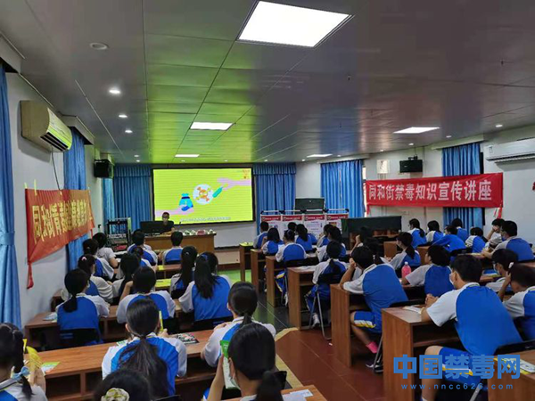 中国禁毒网讯 7月7日,广州市白云区同和街禁毒专职人员前往启明中学多媒体教室开展以"健康人生,绿色无毒"为主题的禁毒宣讲活动。