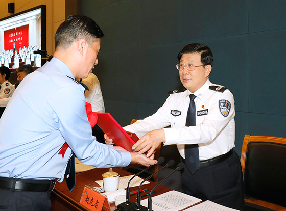 7月27日,全国公安机关庆祝建党100周年安保维稳工作总结表彰电视电话会议在京召开。图为国务委员、公安部党委书记、部长赵克志为受表彰代表颁奖。 图:满博