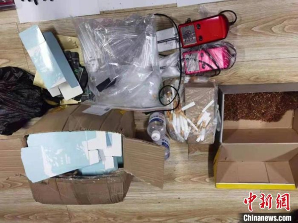 警方查获的含有合成大麻素的烟丝,烟壳,包装,卷烟机。 警方供图