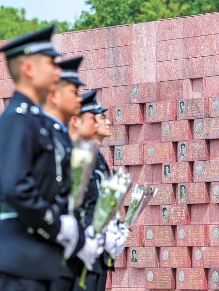 9月29日,广州出入境边防检查总站顺德出入境边防检查站民警来到广东公安英雄广场,向为平安广东献出宝贵生命的公安英烈默哀、献花,并重温入党誓词。图为民警向公安英烈墙献花。黄东航摄