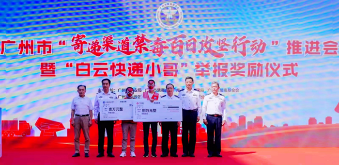 10月19日,广州市在白云区组织召开全市寄递渠道禁毒百日攻坚行动推进会暨“白云快递小哥”举报奖励仪式。