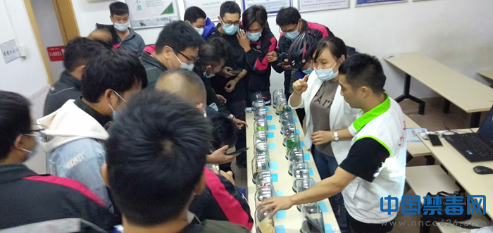 图为物流寄递从业人员观察毒品仿真模型。中国禁毒网发