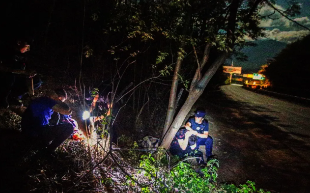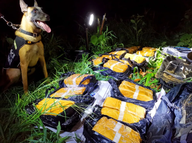 “在距离检查点2公里处,有人背着背包,慌忙跑向后山密林里。”8月3日21时许,芒颜边境检查站根据群众举报线索,派出执勤民警带上警犬“鹰空”迅速前往核查,从一处草丛里发现2个双肩背包和1个黑色手提旅行包,当场从3个包内查获冰毒36块,净重35.524公斤。