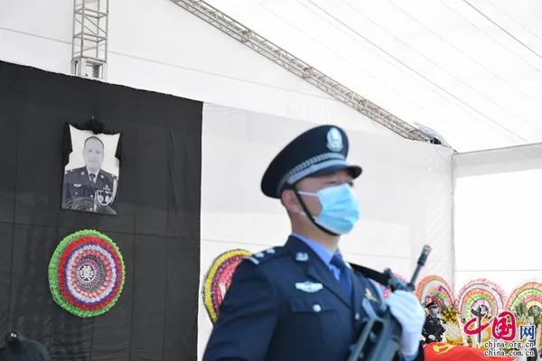 花圈锦簇,党旗覆盖。“缉毒勇士血洒祖国边陲砥砺奋进传承英雄精神”两侧的挽联是对英雄的缅怀。