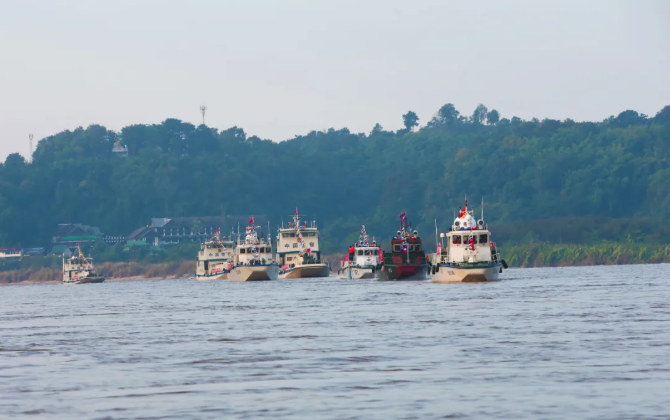 2011年12月10日10时30分,3发信号弹划过天空,“起航”命令响彻关累港,中老缅泰湄公河联合巡逻执法首次巡航正式启动,当时已中断两个多月的湄公河国际航运终于恢复,四国联合巡逻执法编队时刻守卫着湄公河沿线的安全。